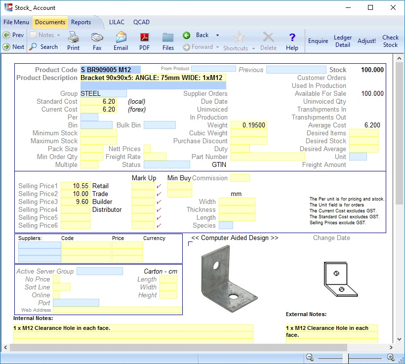 A typical example of a LILAC Stock Account document which establishes the parameters of an individual part or product.