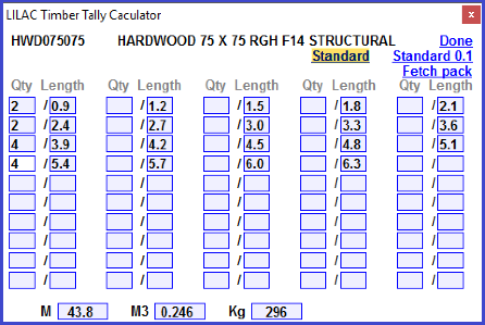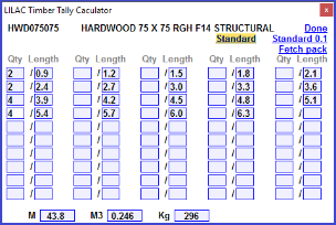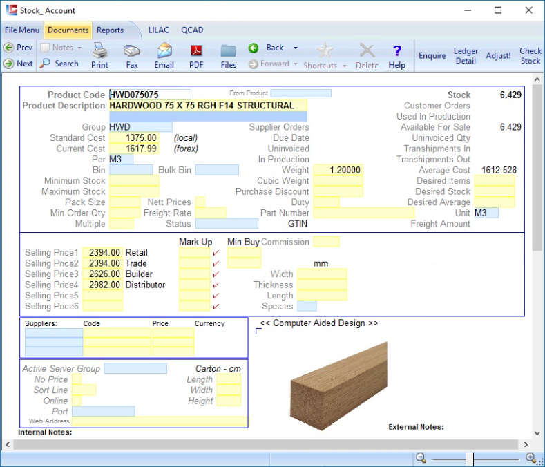 Orders, Cutting Lists, Invoices, and Despatch Documents compute quantity and price calculations allowing stock levels to be maintained in an appropriate unit of measure - most often M3 (Cubic Metres).